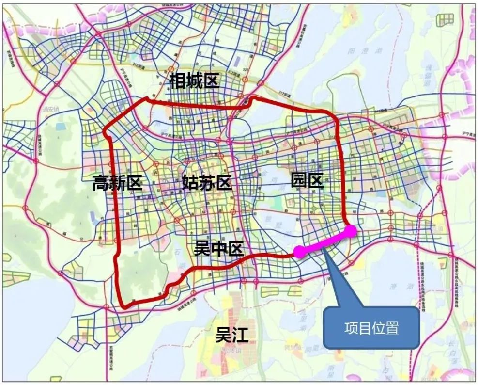 苏州国际快速物流通道二期工程-南湖路快速路东延工程(园区段)是规划苏州中环快速路南段组成部分,它与中环东线、西线、北线等其他快速路共同构建苏州快速骨架路网,为园区和吴中区之间建立的快速联系通道,能有效分流独墅湖隧道的交通压力。