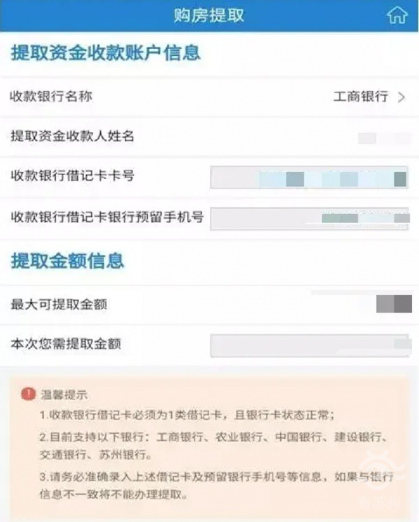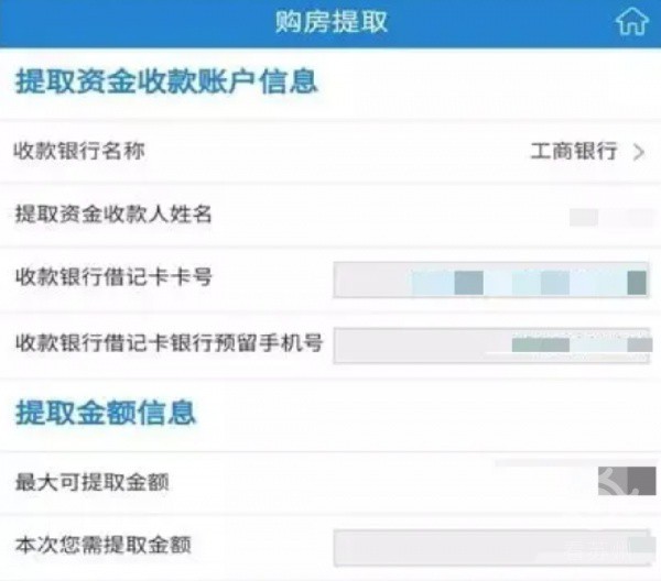 购房发票信息校验通过后,填写收款账户及提取金额。