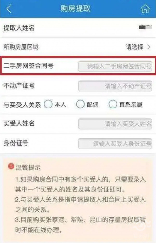 购买存量房(二手房)的公积金提取:在购房信息页面依次填写二手房网签合同号、不动产证号,再点选“与买受人关系”,填写买受人姓名、身份证号。