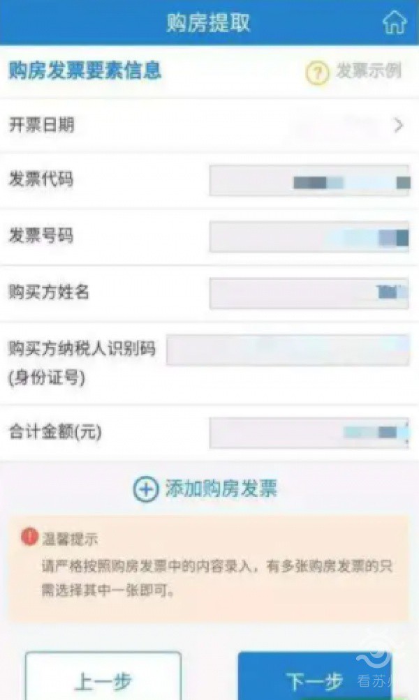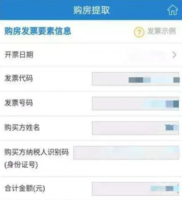 在“购房发票要素信息”页面填写,开票日期、发票代码、发票号码、购买方姓名、购买方纳税人识别码、合计金额。