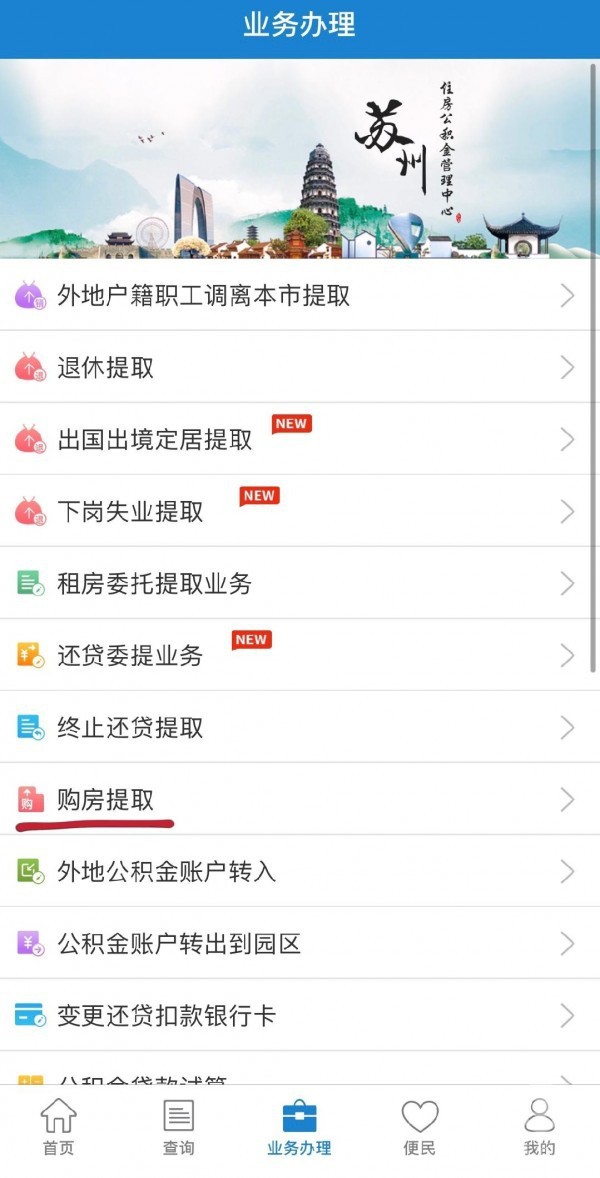 打开苏州公积金APP,在业务办理栏目选中“购房提取”,输入本人预先设定的公积金取款密码,然后选择所购买房屋类型: