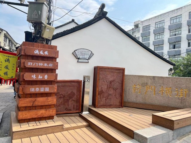来到位于双塔街道的葑门横街,老街上人群熙攘,每家店铺前都围着前来采买的市民。在老街入口处,记者注意到了一处新增的城市街景。