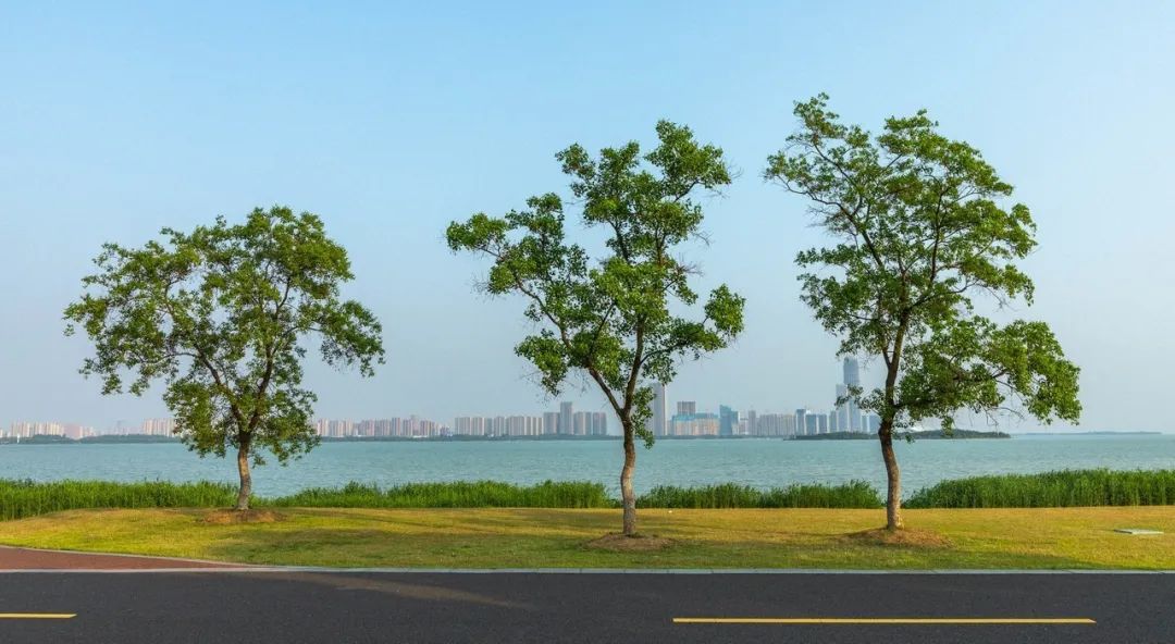 骑单车差不多5分钟的路程,就到苏州湾了。从这里望过去,正看到对面的太湖新城。