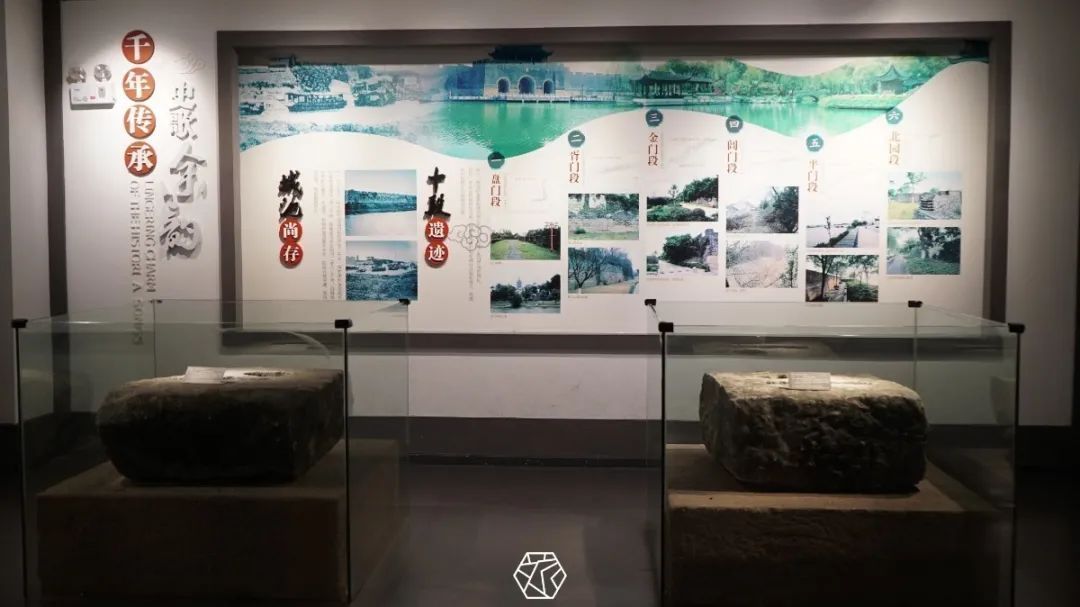 展厅左侧是通过考古研究,对城门的出土遗迹与出土文物进行的盘点汇总。展柜中的两块大青石门臼是1980年12月,在城东相门疏通河道时,在相门大桥西堍南侧28米处发现的古水门门臼。经过对水城门的基础碳14法测定,相门古水门的建筑年代是汉代。