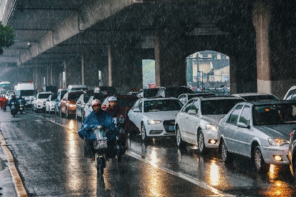 伴着闷雷雨丝倾泻而下,给苏州早高峰的路面带来了一丝“凉意”。