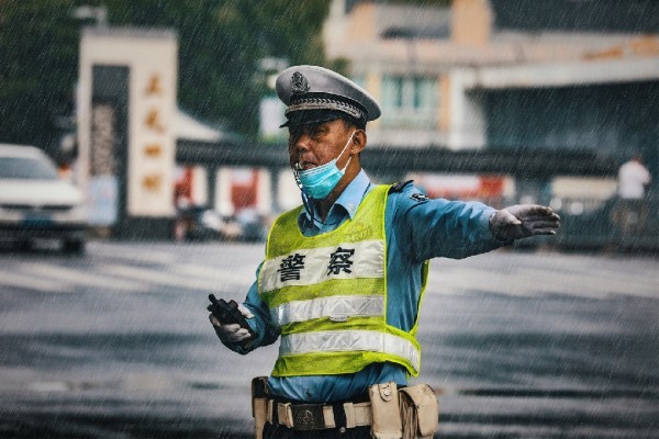 “穿上雨披太闷了,指挥交通不方便,反正闷出汗也是湿透,小雨我就不穿雨披了。”西环路与干将路交叉口的袁警官冒着雨指挥交通。
