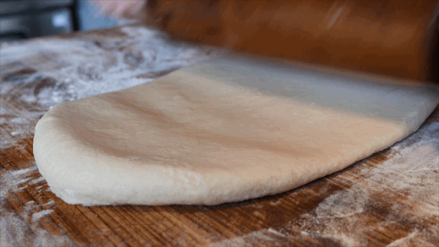 案板上撒上面粉,厚厚的水油面包裹着一大块油酥,按压平整后用擀面杖来回折叠,擀成薄薄的长方形。卷起后,分割成约35克的小剂子,接着就可以包月饼了。