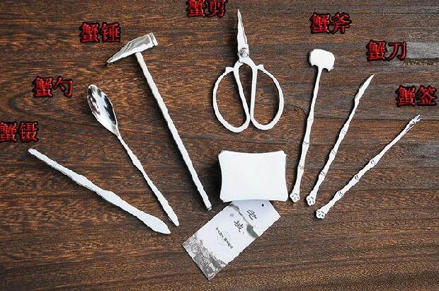 自古以来,食蟹就是大有讲究的雅事。早在明代,能工巧匠已经创制出一整套的食蟹工具。明代最初发明食蟹餐具的人叫漕书,创造了锤、刀、钳工具。食蟹工具后来逐渐增加为8件,包括锤、镦、钳、铲、匙、叉、刮、针,称为“蟹八件”。食蟹工具发展到鼎盛时期,最多的一套竟然多达64件。食蟹工具一般用铜制作,考究的则用白银制作,也有用黄金制作的。黄金虽贵,但是从坚韧度来说反倒不及银,而铜又很容易污染食品,所以最上乘的“蟹八件”还是白银的。我们最常见的“蟹八件”包括腰圆锤、长柄斧、签子、长柄勺、镊子、剪刀、剔凳、盆,分别有垫、敲、劈、叉、剪、夹、剔、盛等多种功能。
