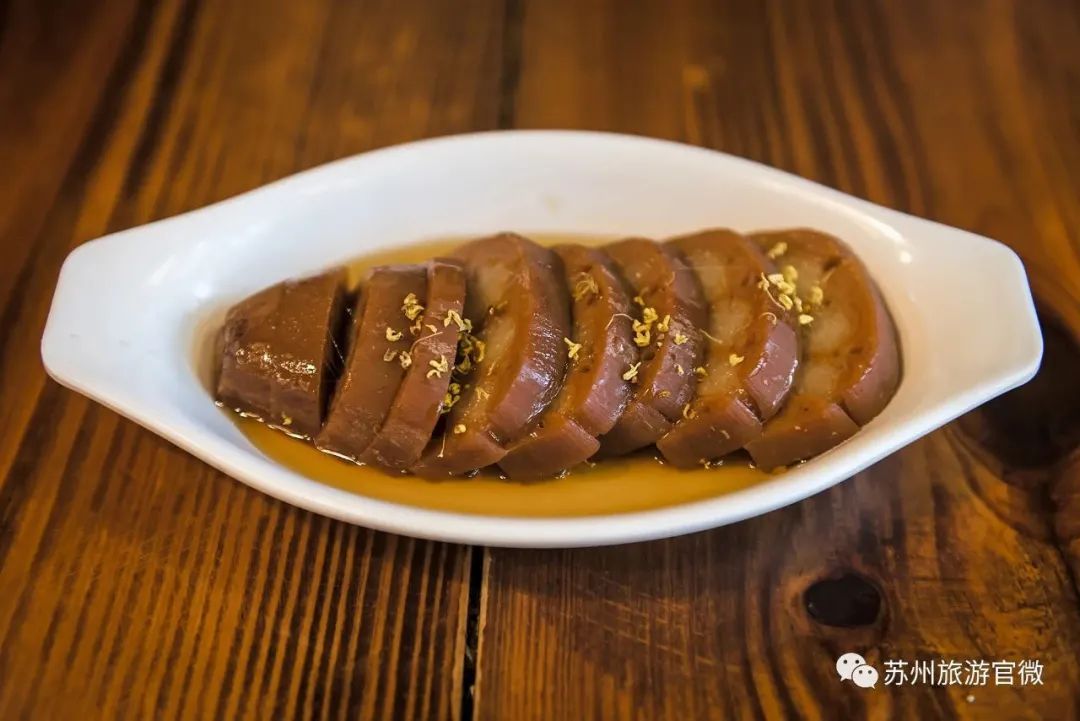 桂花糖藕不上桌,玲珑江南不入秋。糯米在糖藕的孔洞里被闷到软糯透明,白嫩清脆的藕段变成了粉糯的质地。桂花,是糖藕的点睛之笔。桂花的香气和糖藕的香甜软糯相结合,沁在甜丝丝的汁水中,成为秋天甜蜜的一道菜品。