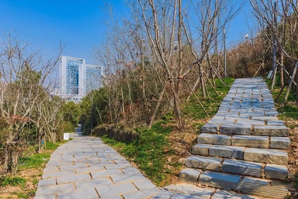在龙山体育公园,全省首条城市山林智慧健身步道依山而建,蜿蜒向上,总长达到三公里,是城市中心难得一见的山林步道。