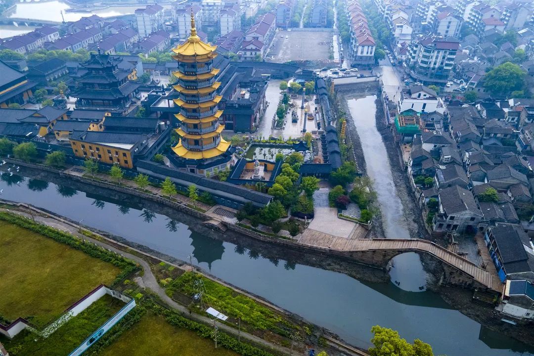 平望小镇在周边民众看来不得不提的还有小九华寺,黄色高墙掩盖不住琉璃宝刹,外观庄严,占地颇大,乍一看与古朴的小镇仿佛格格不入。小九华寺东有一墙面整整一面镌刻了平望的人文,简直是一部简化的平望诗歌史,寺南有广场,直接连接莺脰湖,湖面浩渺,烟波不断。