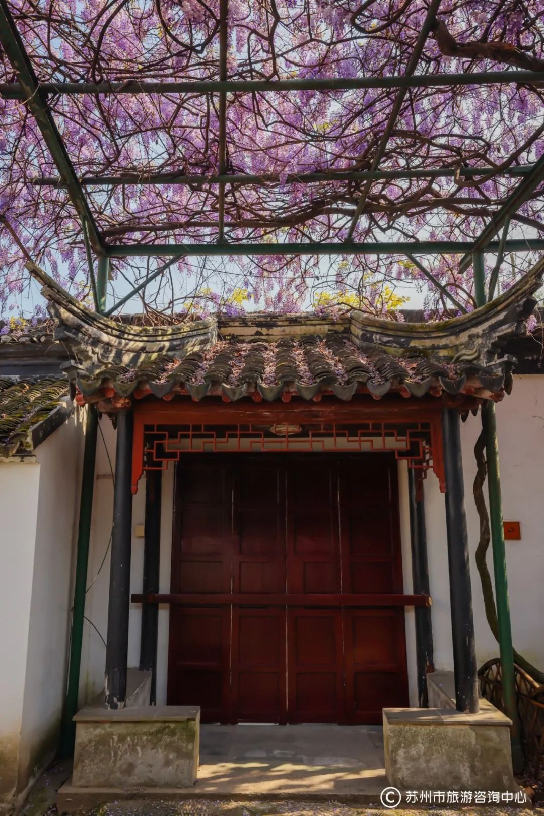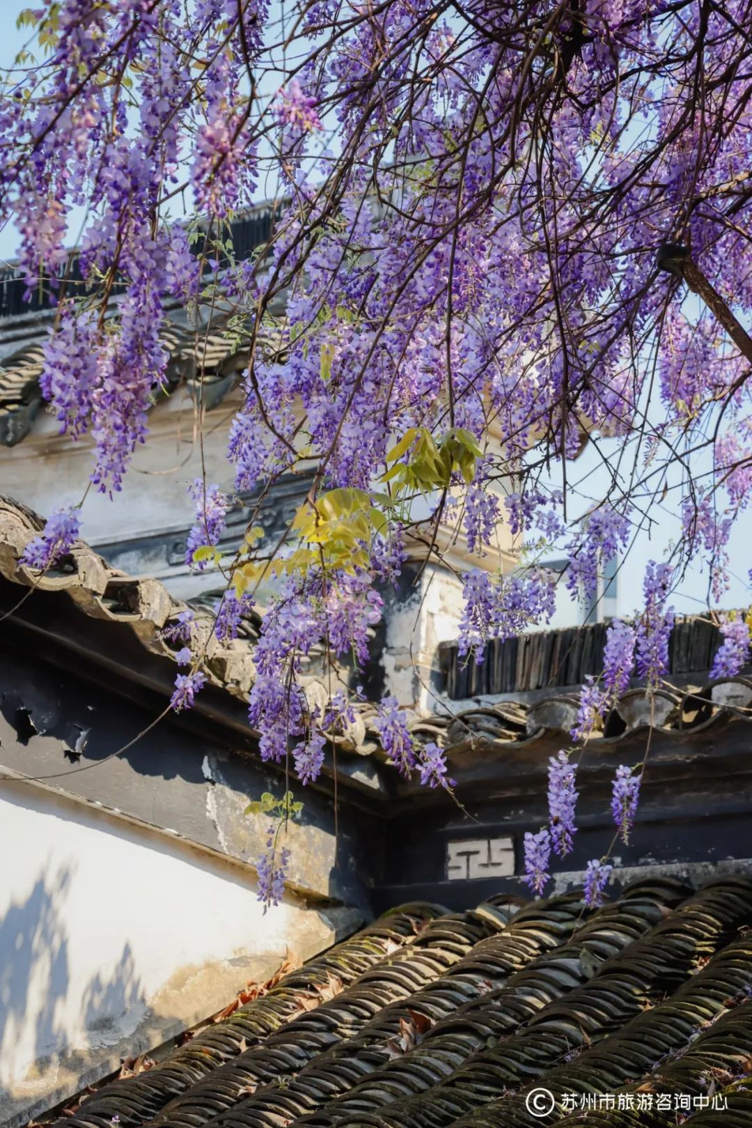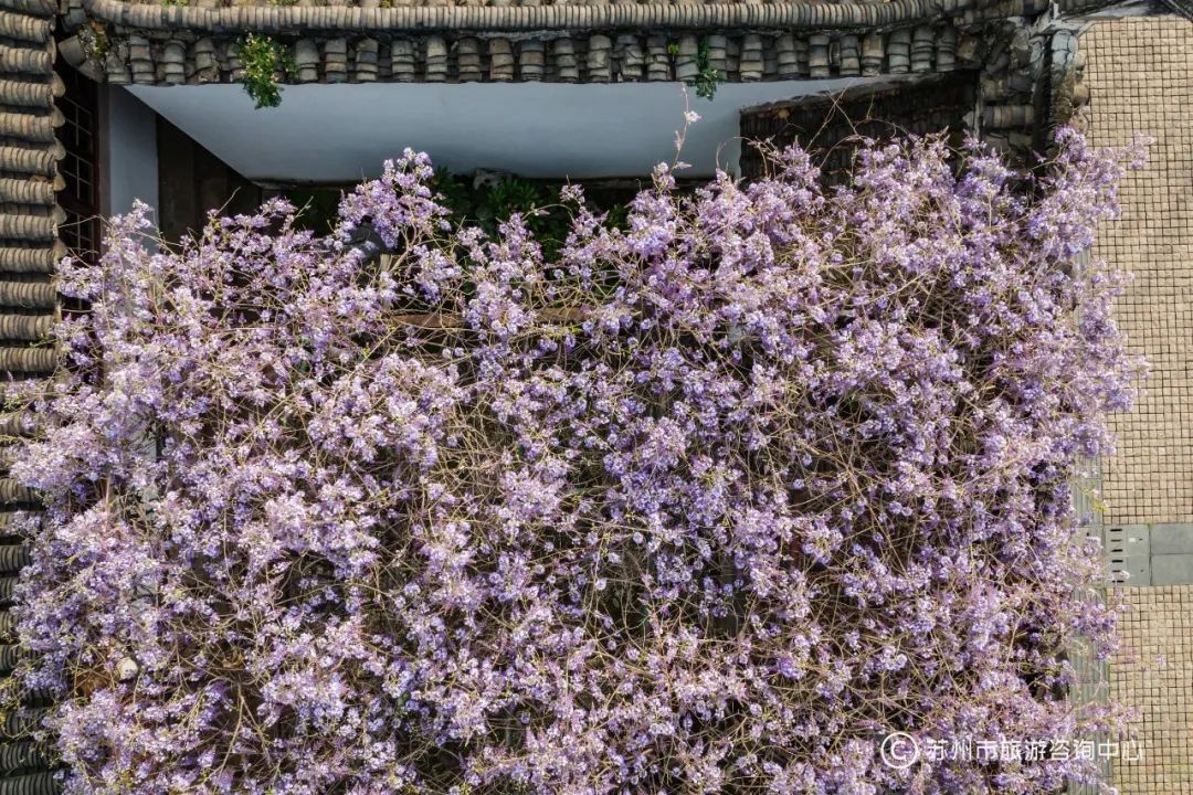 “文藤”花开时,如璎珞流苏,如紫玉悬垂,随风摇曳,极复古意,紫藤旁还有清末名臣端方的题刻“文衡山先生手植藤”。“文藤”从高高的白墙上悬垂而下,每每有人从东北街路过时,总会被它吸引,驻足欣赏。