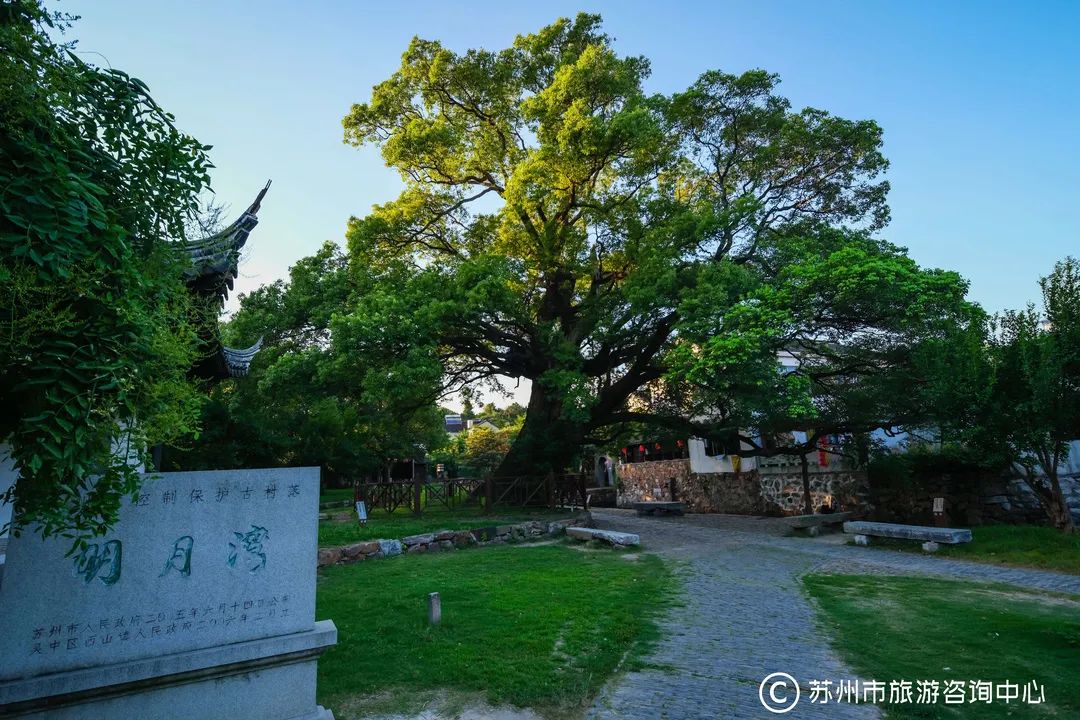 明月湾村口的古樟树,相传由唐朝诗人刘长卿访友时所植,距今已有1200多年的历史。孑然高耸的古樟树,就如恂恂老者,陪伴着古老的村落迎送着千万个日落日出。