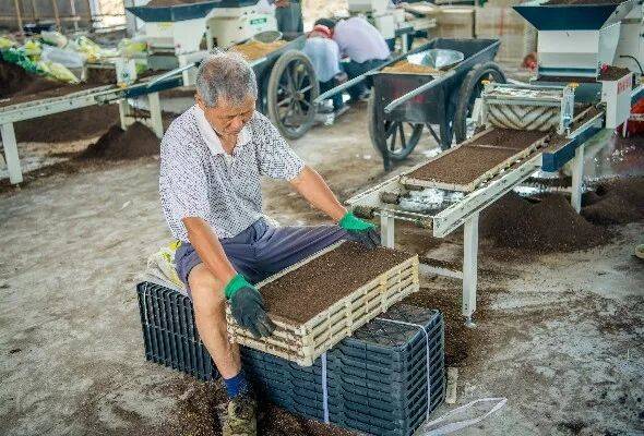 在吴中区临湖镇湖嘉水稻种植基地的生产车间里,一台半自动水稻育秧播种机在几位农户的辅助下,正不停地运转着:先在育苗盘里垫一层基质土,然后均匀撒上稻种,再盖上一层基质土。基地负责人莫泉林说,别小看这台机子,每小时至少能完成800盘育苗盘的播种。“覆土盖好以后,48个小时苗已经破土出来了,出来后我们就放到大厅里去培育,正常15天就可以移栽了。”