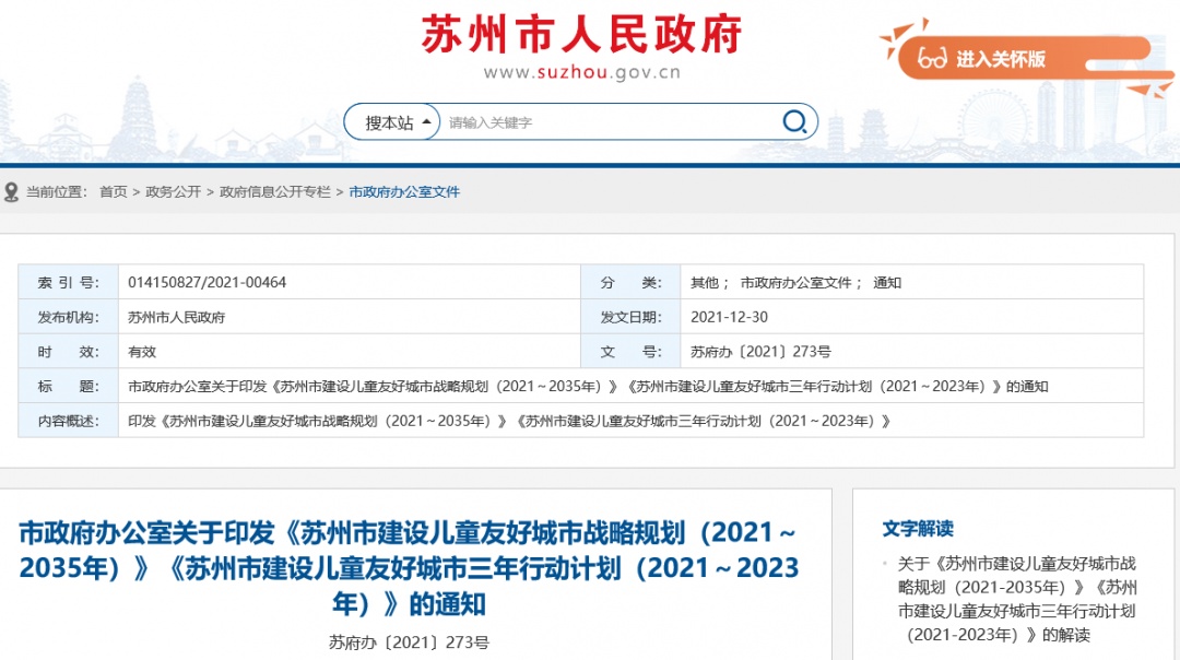 去年底、今年初,市政府研究讨论通过并发布了《苏州市儿童友好城市建设的战略规划》,提出了未来十五年儿童友好城市建设的工作目标,同时还发布了《儿童友好城市建设的三年行动计划》。随后,市妇儿工委办积极牵头推动,制定出台了苏州市儿童友好出行、儿童友好医院、儿童友好社区和儿童友好学校四个方面的建设指引。