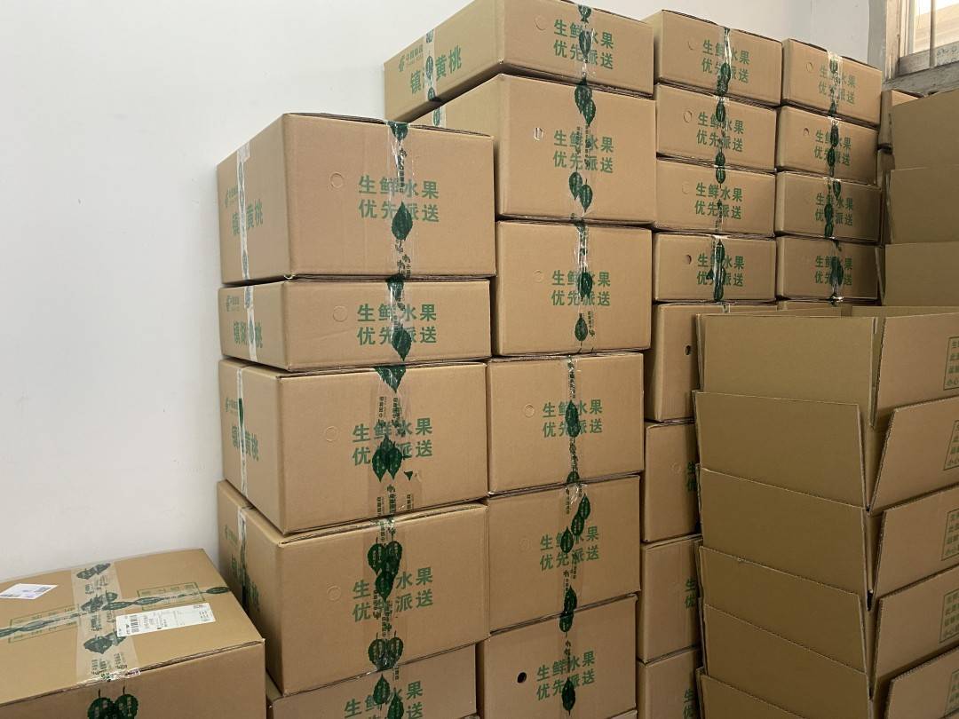 新桥村快递收发室的房间一角,堆满了成箱的黄桃。