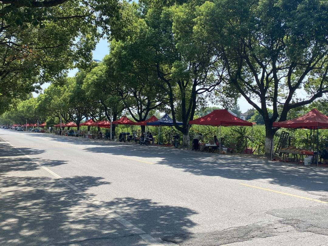 8月10日上午10点,室外气温已达39°C,炎热的天气依然挡不住果农们卖桃的热情,早早地在马路边摆好了摊位招揽顾客。