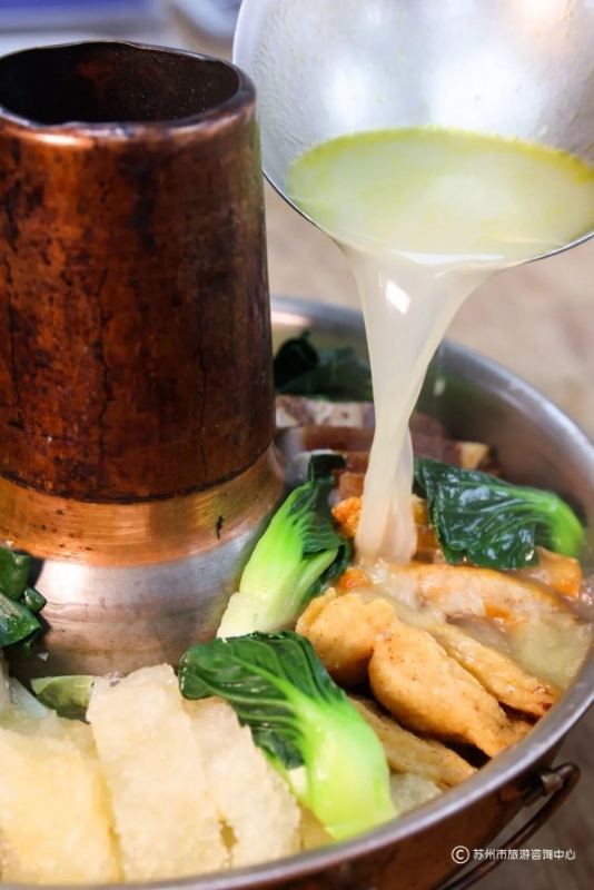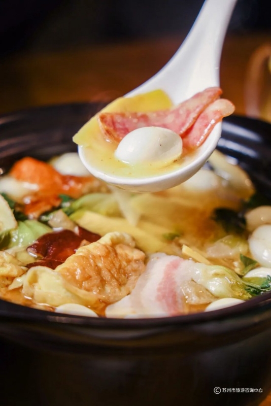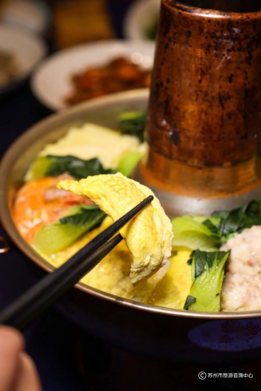 一锅热气腾腾的苏式暖锅是冬至夜团圆饭的重头戏,暖锅中以白菜打底,蛋饺、肉圆、咸鸡、爆鱼、冬笋、咸肉、鹌鹑蛋、鱼丸等多种食材围成一圈,摆放整齐,加入高汤,炉火保温。