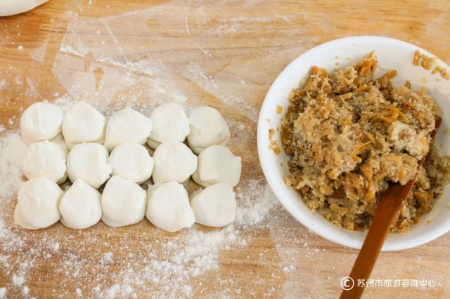 冬至节前,苏州家家户户磨粉制团,以鲜肉、豆沙、芝麻、萝卜丝等物为馅,名为“冬至团”。