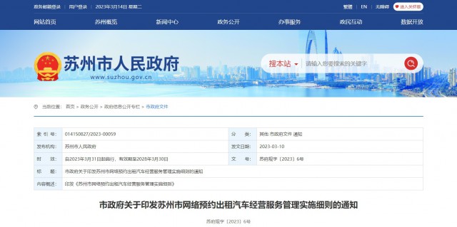 近日,《苏州市网络预约出租汽车经营服务管理实施细则的通知》印发: