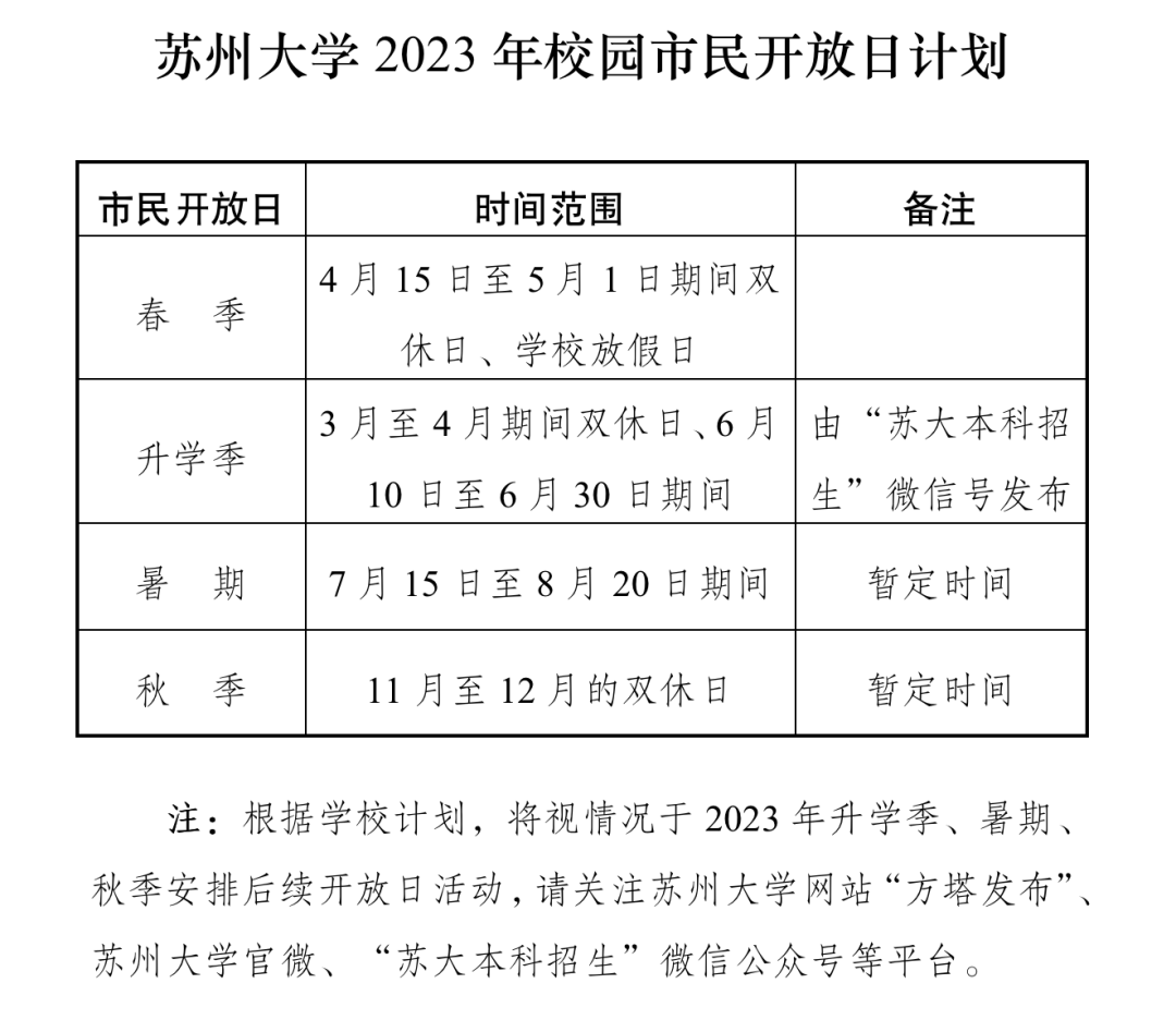一、校园开放日时间请参考苏州大学2023年校园市民开放日计划(具体活动日期请关注苏州大学网站“方塔发布”),开放区域为苏州大学天赐庄校区(本部)。