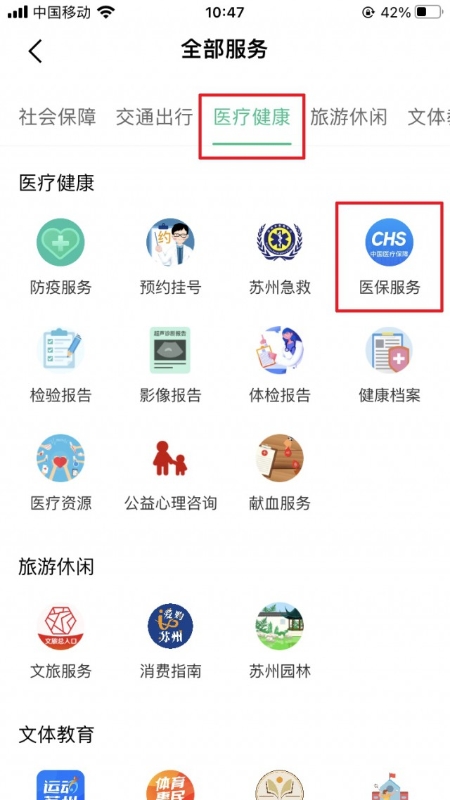 02、在全部服务中选择“医疗健康”板块,点击“医保服务”。