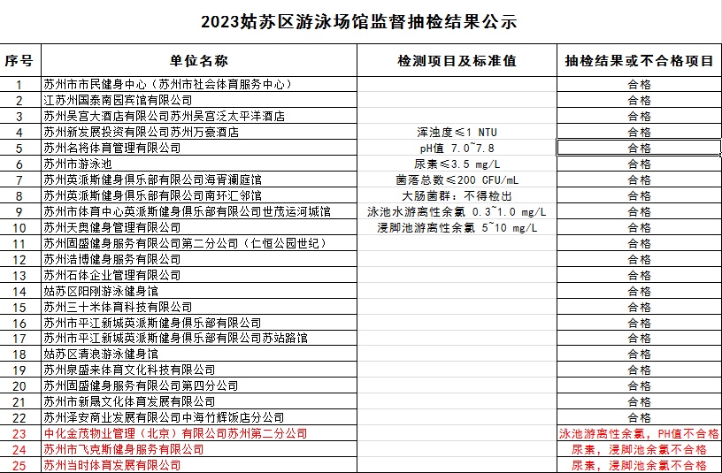 日前,姑苏区卫生监督所对辖区内25家游泳场所进行了监督抽检。