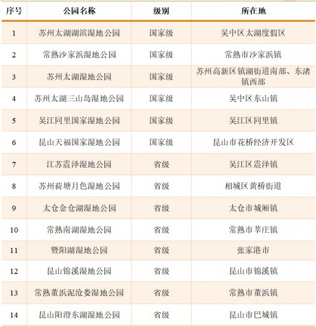 目前,苏州已建成省级以上湿地公园14个,其中国家级6个,省级8个。