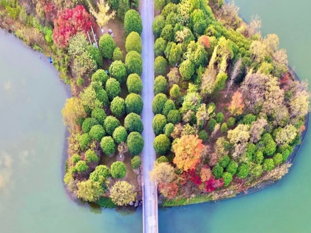 苏州虎丘湿地公园,夏日时仿佛绿野仙踪、秘境森林,入秋后则似珊瑚灼海、彩霞万丈。