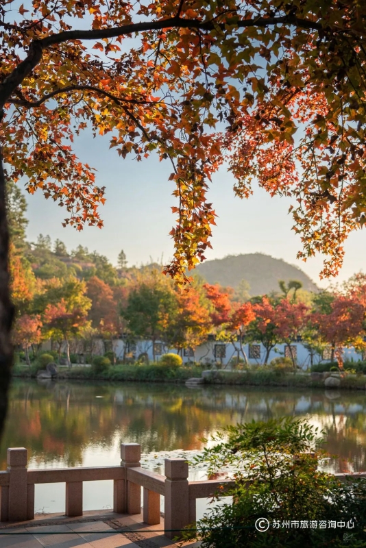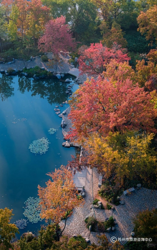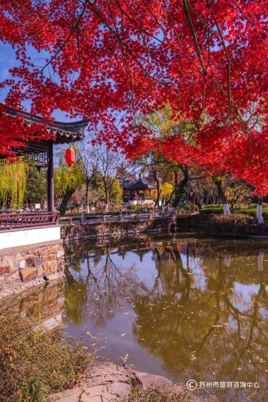 深秋时节的苏州是五彩斑斓的,银杏落地如金,芦花飘飞似雪,水杉层林尽染,绚丽多彩,而枫叶那一抹亮眼的“红”正在成为近期最美的暖调。