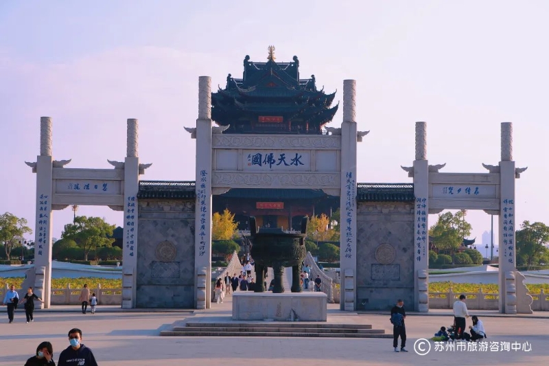 最后来到重元寺(门票20元),寺院建筑如一朵莲花静静绽放在阳澄湖中,有一种“水天佛国”的意境。这里是半岛观日落的好点位,晚风吹拂,红霞漫天,感受大自然赋予的浪漫与温柔。