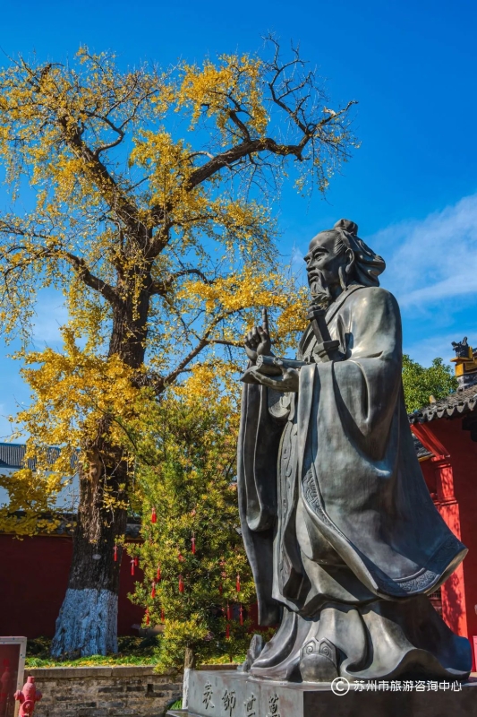 始建于北宋的常熟文庙(门票10元),院中植有多棵银杏树,其中树龄最高的一棵将近500年。银杏景观与红墙黑瓦的古建筑,形成鲜明的色彩对比。