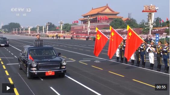 伟大旗帜光耀千秋。中国共产党党旗、中华人民共和国国旗、中国人民解放军军旗在受阅部队最前方迎风招展。检阅车行进至党旗、国旗、军旗前,敬礼号角响起,习近平停车肃立,以注目礼向三面旗帜庄严致敬。