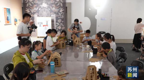 昨天(10月6日)下午,12组亲子家庭走进“知美·拾趣——苏州美术馆美育展”展厅,近距离感受美术馆的公共教育成果。展览中特意保留的空白区域,正是为这次亲子活动预留的创作空间。观展结束后,大家围坐在一起,参与到“团团圆圆共筑彩屋”美誉展装置作品集体创作课中来,动手开始折叠纸板小屋,用画笔涂上缤纷色彩,一起共创艺术装置。