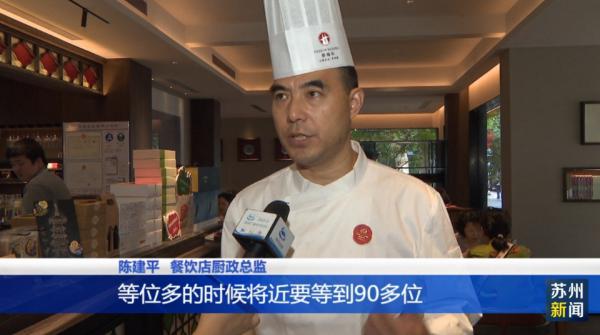 餐饮店厨政总监陈建平介绍,等位多的时候要等到90多桌,一般饭时到下午2点结束,考虑到外地游客的热情,延时中午不休息,基本跟晚餐连在一起,会给等位的客人 准备茶水、小的糕点。