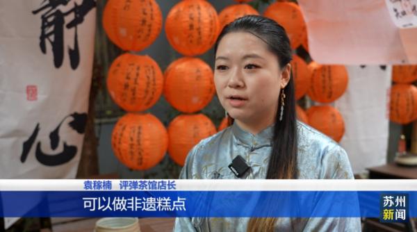 评弹茶馆店长袁稼楠介绍,国庆和中秋人流比较多,特地加到了一天10场演出,从中午的11:30开始,每个半点有一场,增加了《太湖美》《花好月圆》《赏中秋》选段,假期期间推出了定制套餐 ,主要是非遗文化加上评弹文化和茶文化的一个结合,可以做非遗糕点、宋代点茶,还有书法体验。