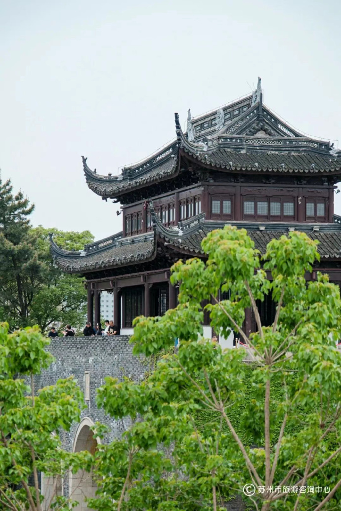 登上阊门城墙,苏州“双面绣”的城市气质一览无余。向西望去,七里山塘的古桥流水尽收眼底,远处的虎丘塔悠然耸立;往东南眺望,现代地标东方之门与古朴的北寺塔形成鲜明对比,绘就一幅古今辉映的江南图景。