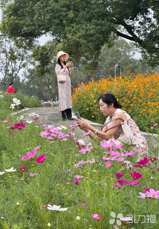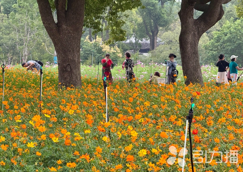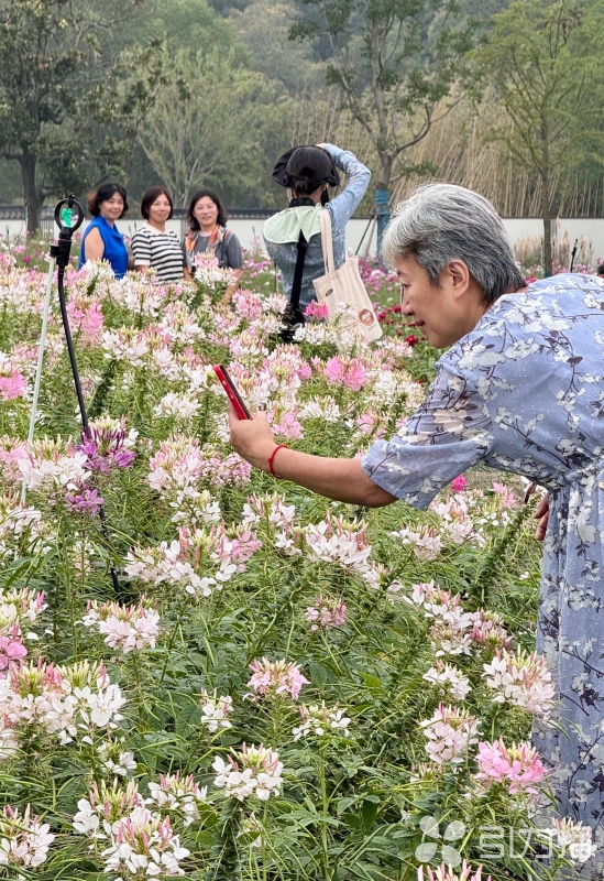 园内各色花海与千年虎丘塔相映成趣,其中粉白醉蝶花随风摇曳似蝶舞,波斯菊花丛错落如星点,游客在秋日暖阳中感受“花映古塔”的独特景致。(记者 张健/文/摄)