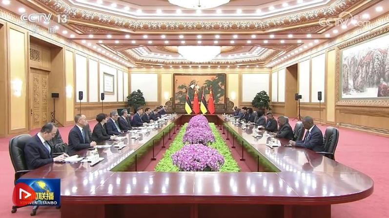 10月14日上午,国家主席习近平在北京人民大会堂会见来华出席全球妇女峰会的莫桑比克总理莱维。