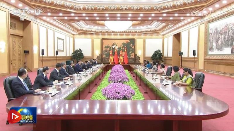 10月14日上午,国家主席习近平在北京人民大会堂会见来华出席全球妇女峰会的斯里兰卡总理阿马拉苏里亚。