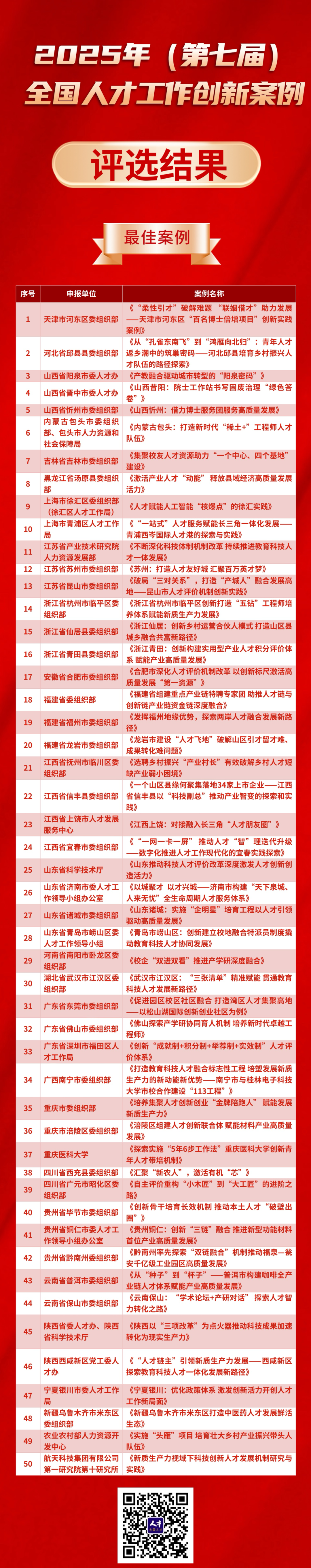 为更好展现各地各部门学习贯彻习近平总书记关于做好新时代人才工作的重要思想,深入实施新时代人才强国战略、强化现代化建设人才支撑的实践成果,中国人才杂志社今年3月举办“2025年(第七届)全国人才工作创新案例征集评选活动”。