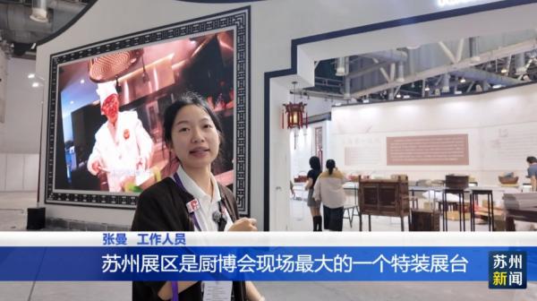 工作人员张曼介绍,苏州展区是厨博会现场最大的一个特装展台,入口的这个位置是序厅,主要承载一些苏州的关于厨具的老物件,菜单做了五国语言,也希望其他国家的来中国参观的游客也能够品尝到苏州当地比较特色的苏帮菜。