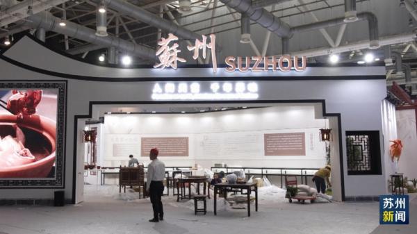 苏州展区不仅有非遗名菜名点,还有苏帮菜的现场技能展示,推荐菜单上还用了不同的语言。搭配旁边精巧的展陈,满满都是巧思。