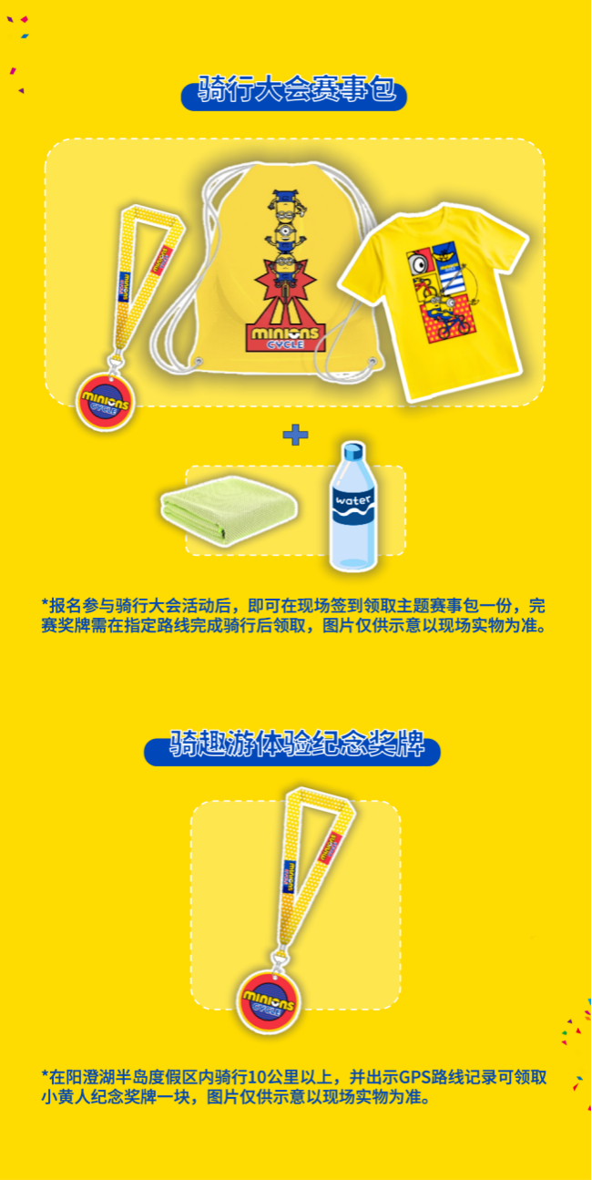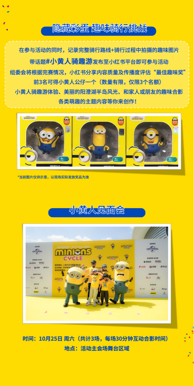 此外,在参与活动的同时,记录完整骑行路线+骑行过程中拍摄的趣味图片,带话题#小黄人骑趣游发布至小红书平台还可参与“隐藏彩蛋 趣味骑行挑战”活动,后续活动主办方将根据完赛情况、小红书分享内容质量及传播度评估“最佳趣味奖”,前3名可获得小黄人公仔一个。