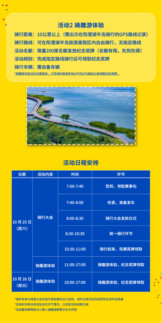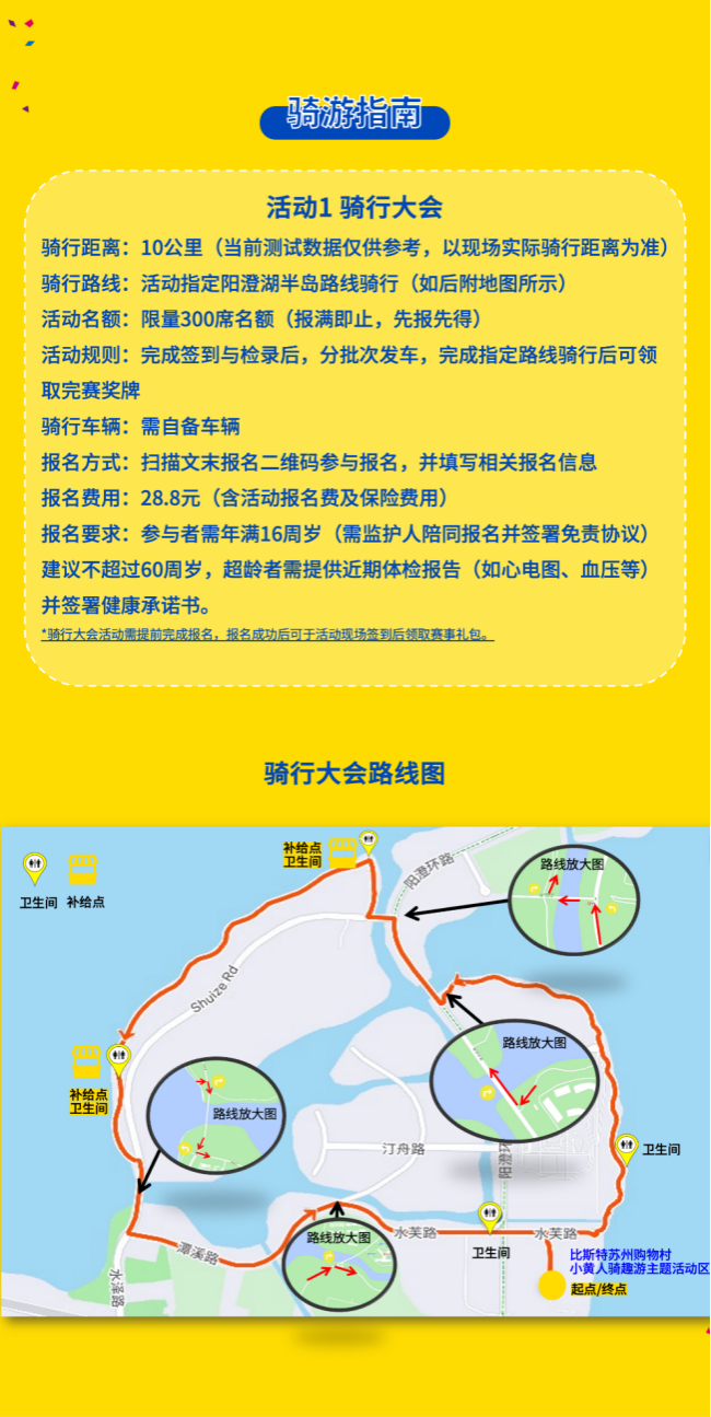 此次活动分为骑行大会、骑趣游体验两种形式,骑行大会需自备车辆、按照指定路线骑行,骑行距离约为10公里,参与者需年满16周岁,完成指定路线骑行后可领取完赛奖牌,报名费用为28.8元;骑趣游体验也需自备车辆,可在阳澄湖半岛旅游度假区内自由骑行,骑行距离为10公里以上(需出示在阳澄湖半岛骑行的GPS路线记录),完成骑行后可获得纪念奖牌(限量200席名额),该项活动无需报名,可凭借码表或手机App的GPS路线记录领取纪念奖牌。