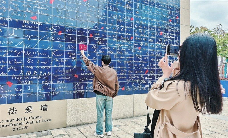 昨日(10月19日),园区李公堤的中法爱墙,游客手持结婚证留影纪念,让美丽秋日为自己的爱情作证。