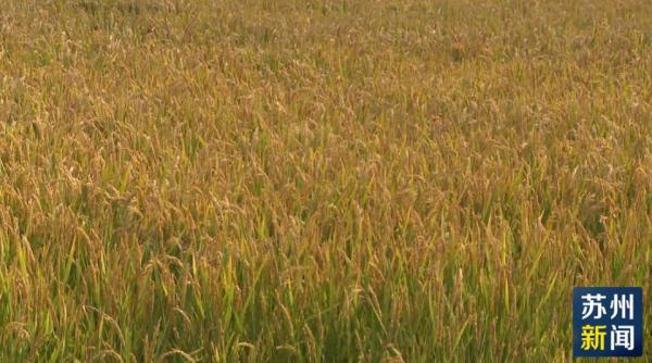 在吴中区临湖镇的水稻种植基地,沉甸甸的稻穗随风摇摆,颗颗稻谷色泽光亮,圆润饱满,收割机正在金色稻浪中来回穿梭。