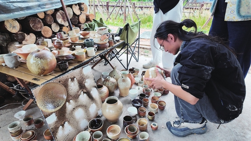 随着窑门缓缓打开,记者看到百余件瓷器在淡淡青烟中逐渐显出真容。陶艺家墨白小心翼翼地依次取出瓷器,每件作品的质地、色泽、纹路皆不相同,如同“抽盲盒”的奇妙体验,引发现场陶艺爱好者阵阵惊叹。