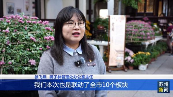 狮子林管理处办公室主任徐飞燕介绍,联动了全市10个板块。以及包括狮子林在内的其它的古典园林单位。也选中了自己的特色作品。展示了全市菊花技艺最高的水准。桩菊、菊石盆景等都可以在这里看到、