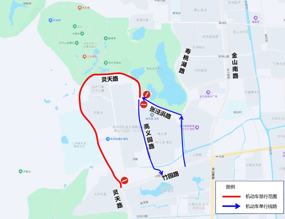 当内圈停车场(天平山景区P1停车场、姑苏印象文化村P2停车场)饱和度达到80%时,针对小汽车实施寿桃湖路—张泾浜路—高义园路、灵天路逆时针单向交通组织。